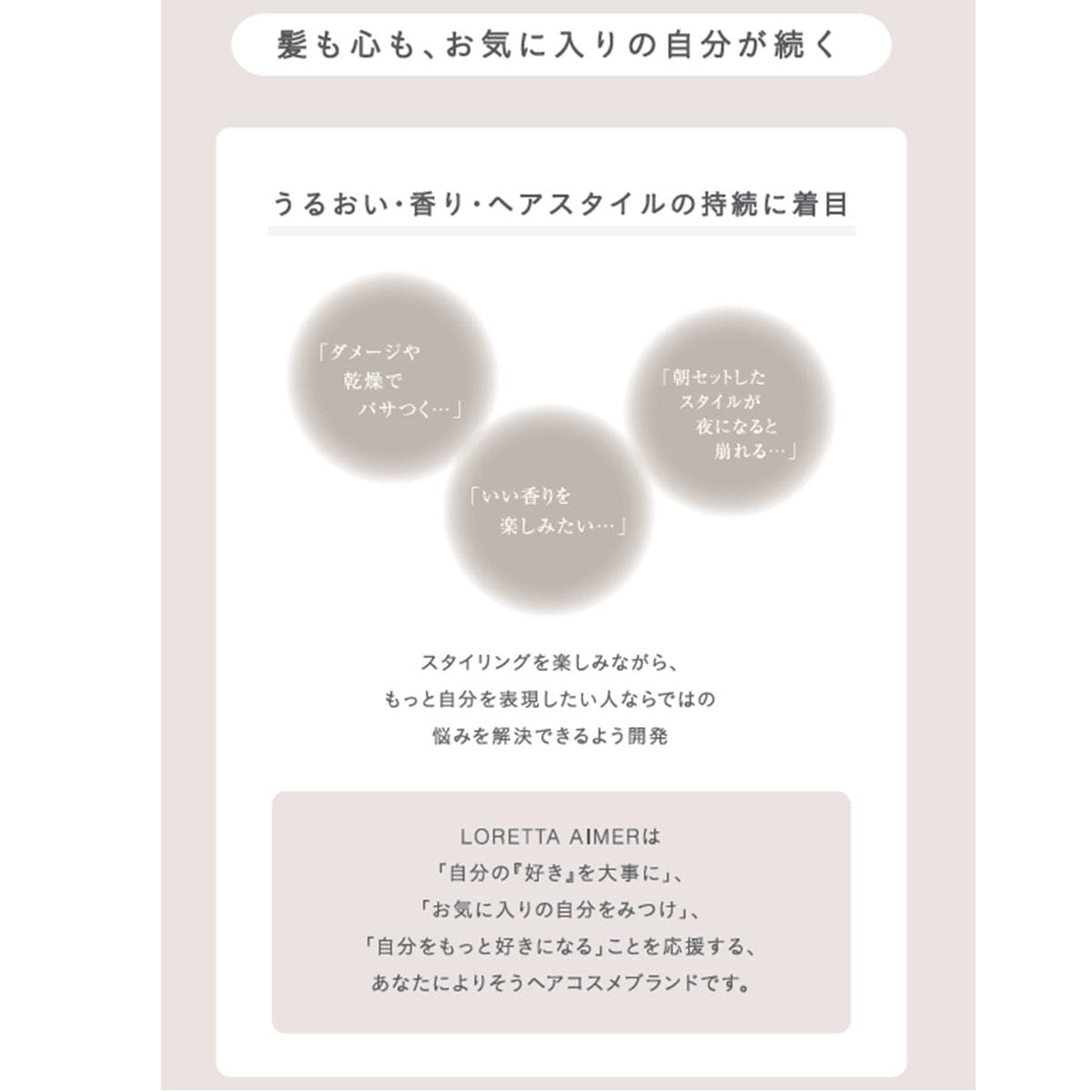 AIMERはフランス語で「好き」、「お気に入り」という意味。ロレッタ エメを使うことで、それぞれが「自分の『好き』を大事に」、「お気に入りの自分をみつけ」、「自分をもっと好きになる」ことを目指しています。ブランドネームには、一人ひとりが自分に自信を持つことができるようにという思いが込められており、「よりそってくれる相棒」をイメージしてデザインを作成しました。