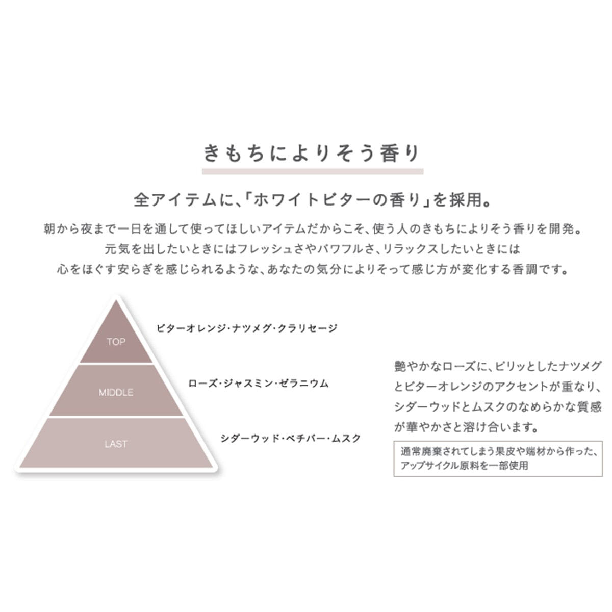 元気を出したいときにはフレッシュさやパワフルさ、リラックスしたいときには心をほぐす安らぎを感じられるような、気分によりそって感じ方が変化するホワイトビターの香りを全アイテムに採用しました。